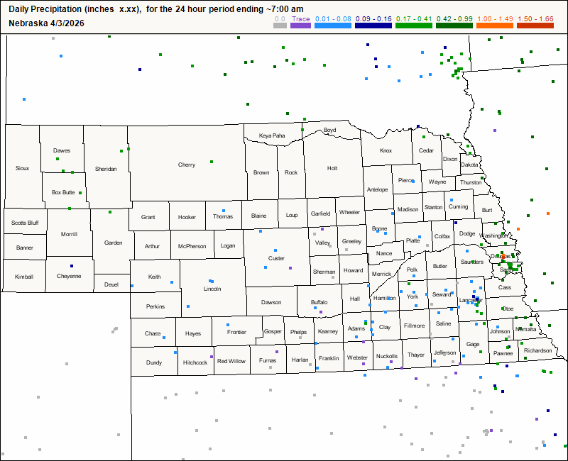 Once you join the Nebraska CoCoRaHS team, your precipitation observations will start showing up daily on our county maps. You will also provide a great service to your community by allowing your friends, neighbors, scientists and others to see how daily precipitation has covered the state. Your reports make a difference!